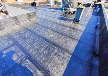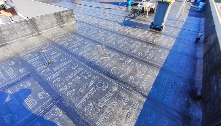 Proteção contra infiltrações em lajes, paredes e áreas molhadas com manta asfáltica.